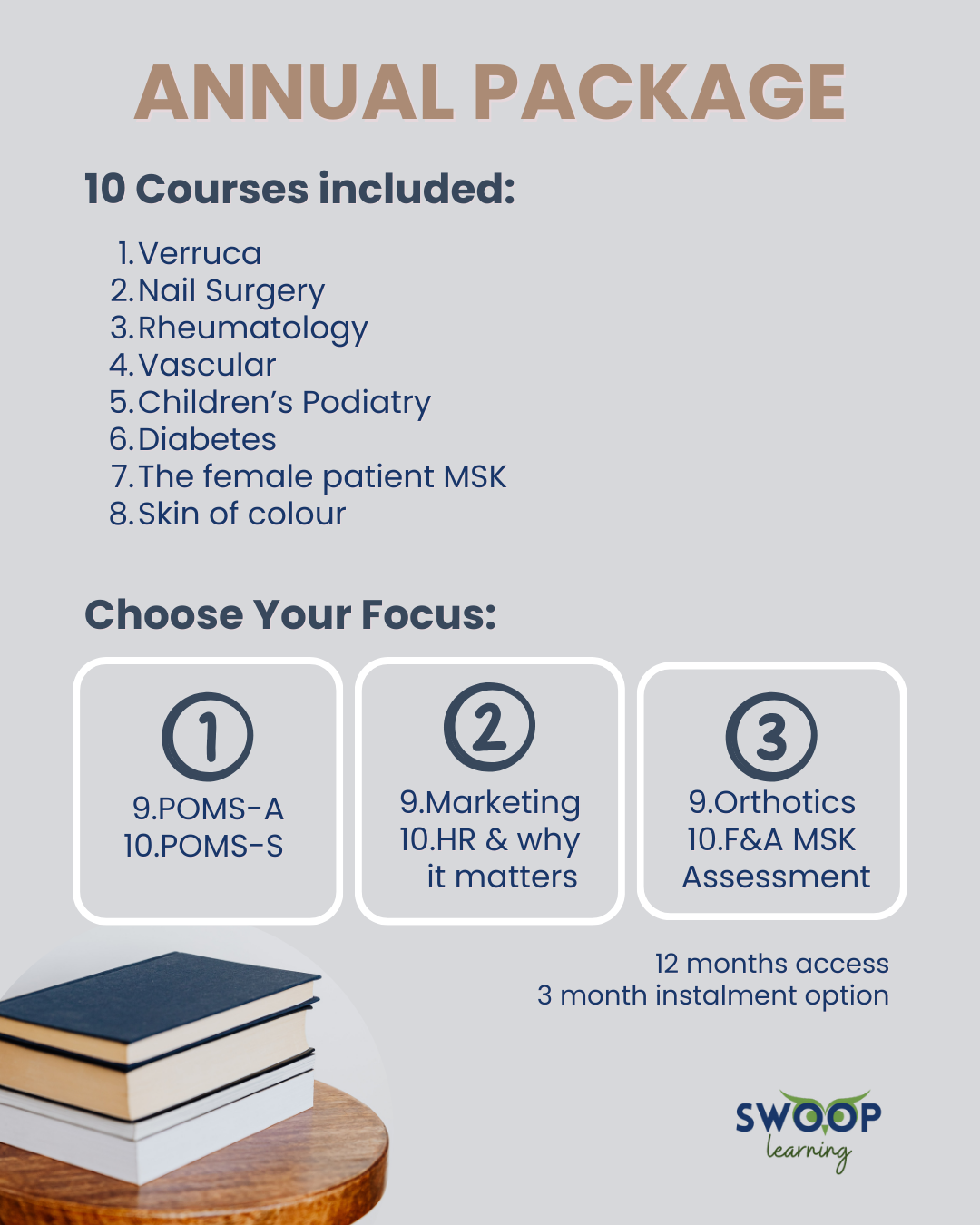 Includes 8 Core Courses (Verruca, Nail Surgery, Rheumatology, etc.) PLUS choose your specialisation: